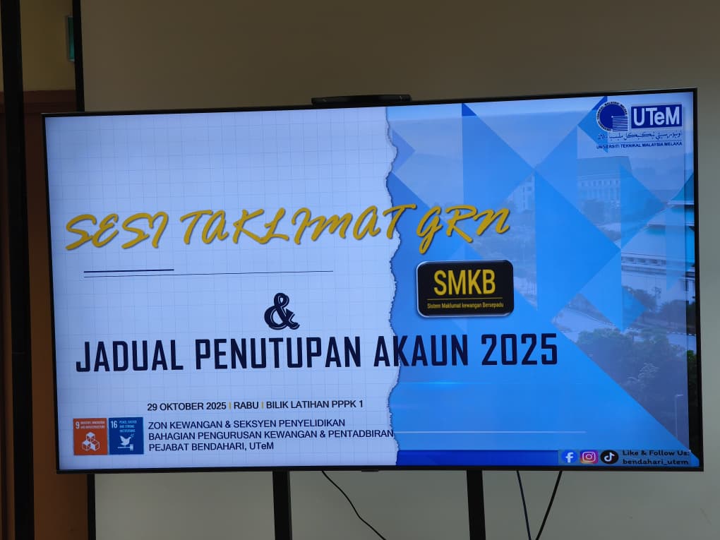 Pejabat Bendahari telah menganjurkan Taklimat Berkaitan Pelaksanaan Proses Good Received Note (GRN) Melalui SMKB v4.0 Di Peringkat PTj dan Penutupan Akaun Bagi Tahun Berakhir 31 Disember 2025. Taklimat ini diadakan bertujuan memberi maklumat yang lebih jelas berkaitan pelaksanaan proses GRN dan juga Penutupan Akaun yang akan bermula tidak lama lagi. Taklimat ini telah disertai oleh pentadbir kewangan di PTj.